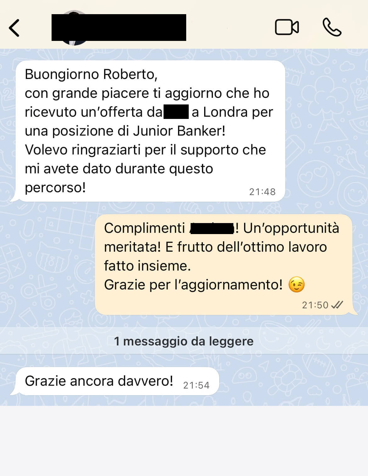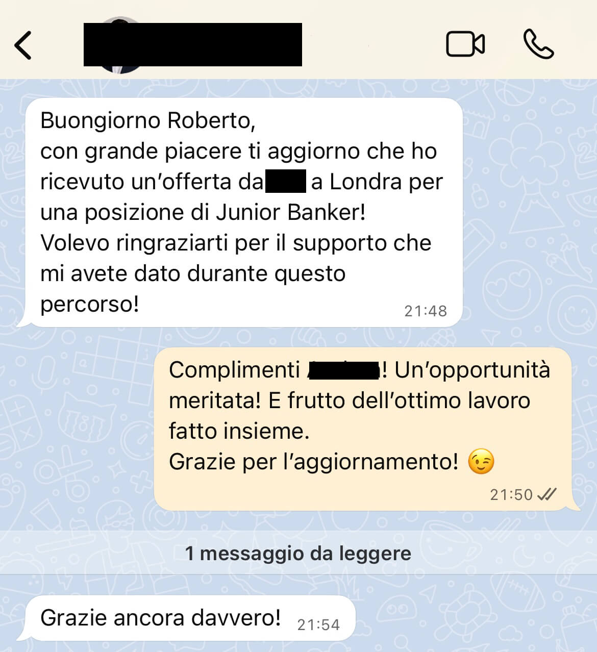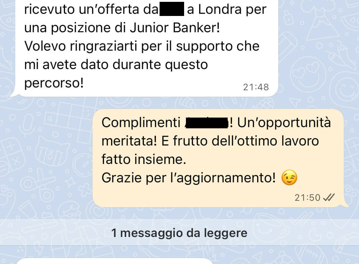 Noi di CarrieraLab.it siamo qui per questo. Abbiamo aiutato più di 100 giovani talenti ad alto potenziale a entrare nelle migliori istituzioni finanziarie: sappiamo cosa serve davvero per superare ogni step e conquistare un posto tra quel 3% che ce la fa.